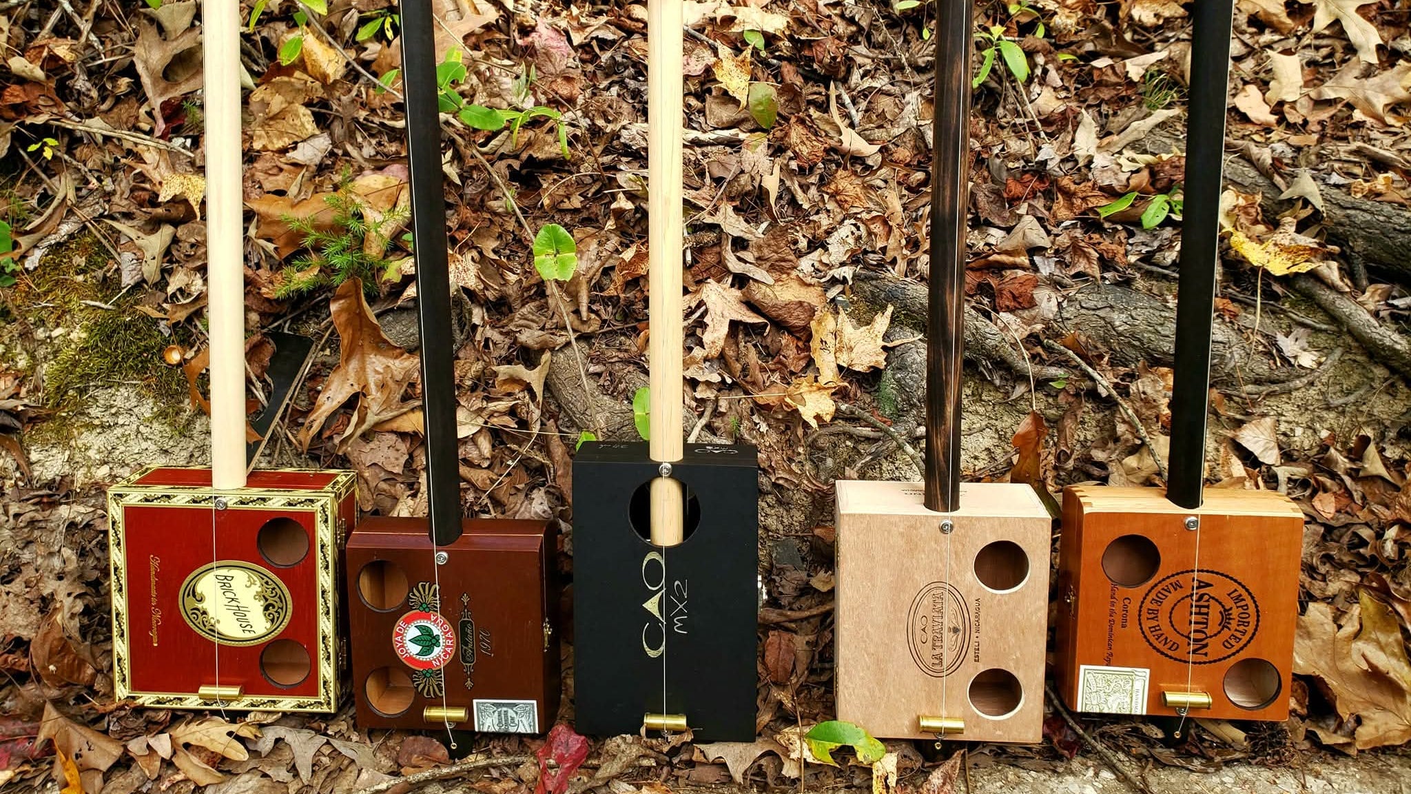 Smaller, popular cigar box banjos crafted with custom sound holes, .44 Magnum...