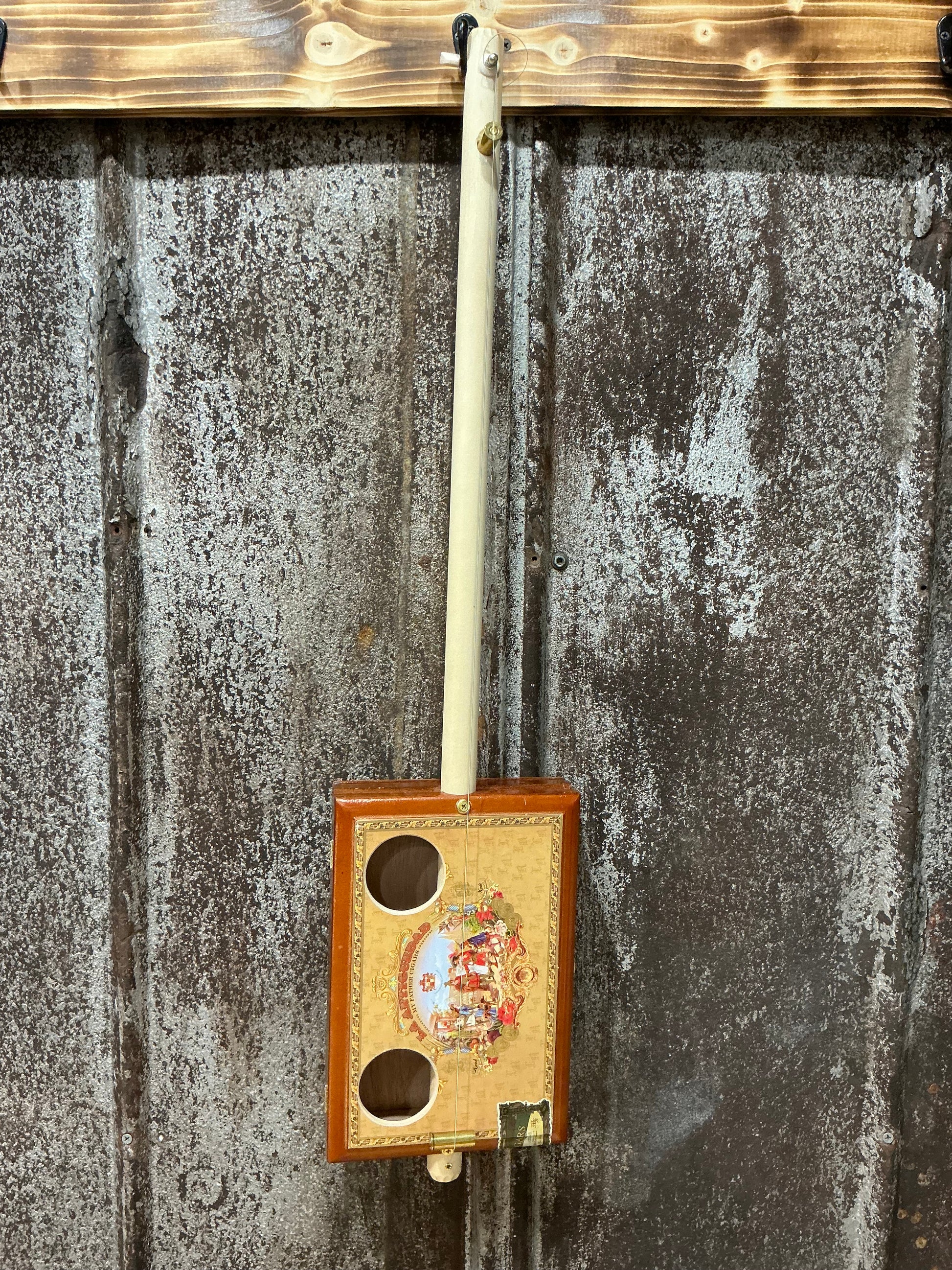 Smoky Mountain Bullet Banjos are unique, one-of-a-kind simple music acoustic banjos that make great campfire companions. These single string musical instruments are made out of genuine cigar boxes and only has one string, which makes them perfect for beginners to experts. And best of all, every banjo comes ready to play and display right out of the box with a 3D printed stand, a glass finger slide, and a pick.